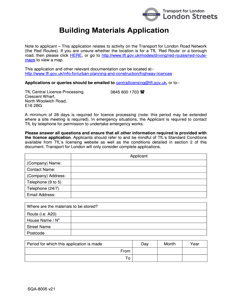 Building Materials Application Note to applicant This application relates to activity on the Transport for London Road Network (the Red Routes). If you are unsure whether the location is for a TFL