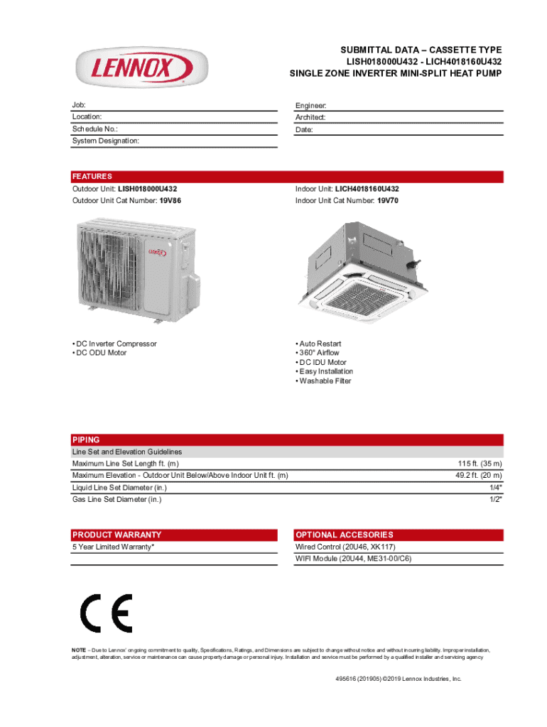 The Single Zone Inverter Mini-Split Heat Pump Submittal Data is a specialized form designed to aid engineers, architects, and installers in detailing specific HVAC systems. This document is crucial in the planning and submission stages of HVAC projects, ensuring that important technical specifications and performance data are accurately conveyed. Common users include professionals engaged in system design, installation, and regulatory compliance.