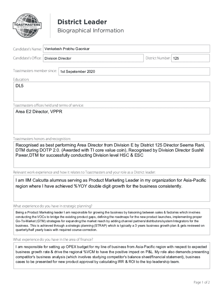 Biographical information, including the candidate’s name, contact details, and Toastmasters membership duration.
