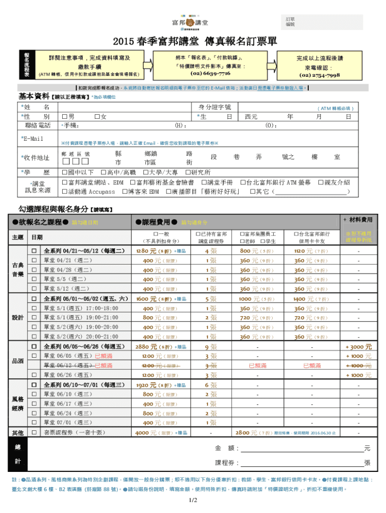 The 2015 Spring Fubon Forum Fax Registration Order Form is a crucial document utilized for registering for various courses offered by the Fubon Art Foundation. It establishes the necessary framework for individuals to enroll in courses, providing a structured way to capture personal information and course selection. This form is essential in securing a spot in highly sought-after classes, as it includes important fields such as '姓名' (Name) and '身分證字號' (ID Number), which must be accurately filled out.