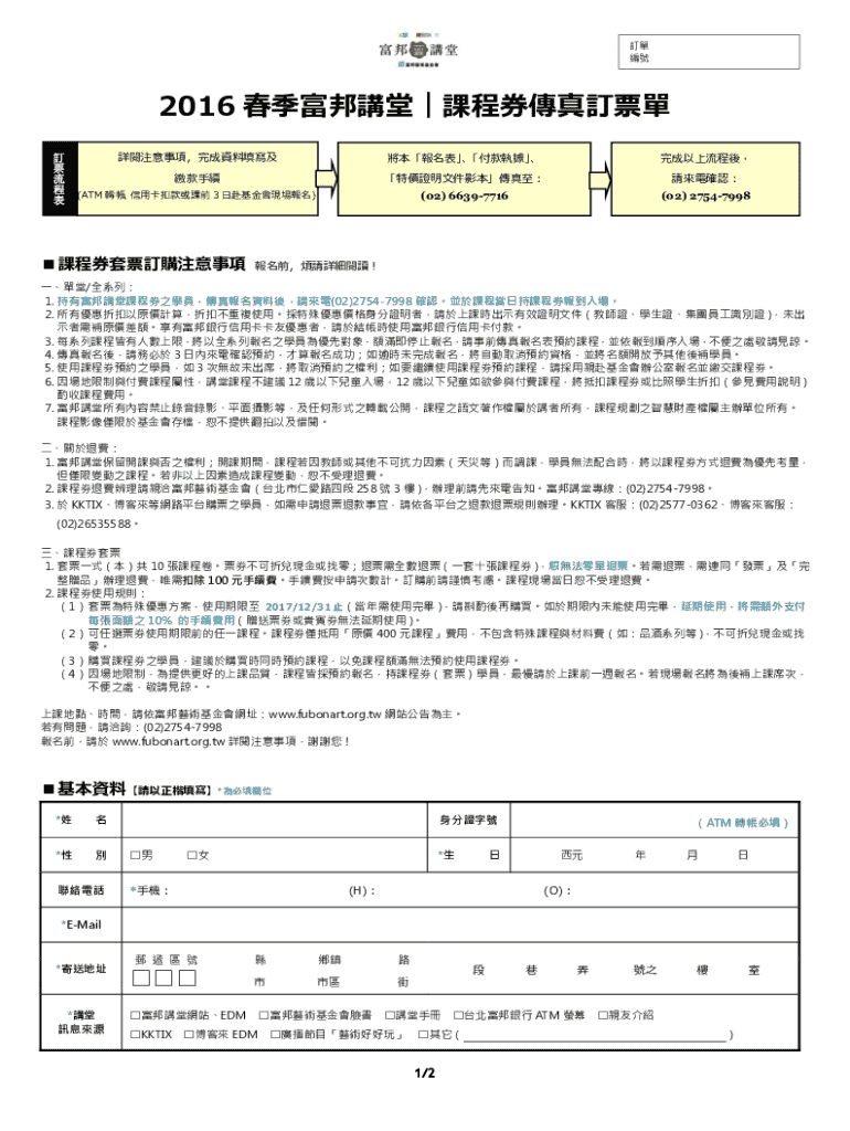 Any individual or entity planning to order tickets for the 2016 Spring Fubon Lecture Hall courses may use this form. It is essential to provide correct personal information and be of legal age to subscribe.