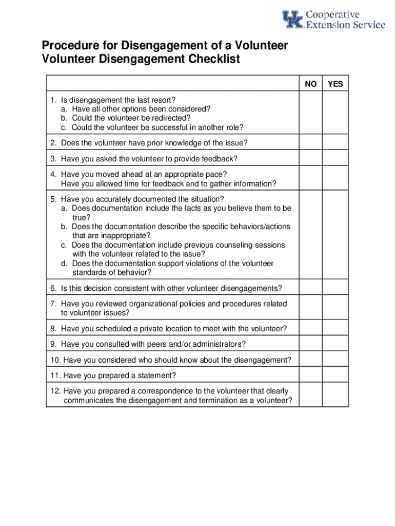 The Volunteer Disengagement Checklist is a form used by organizations to document the process of terminating a volunteer's service fairly and systematically.