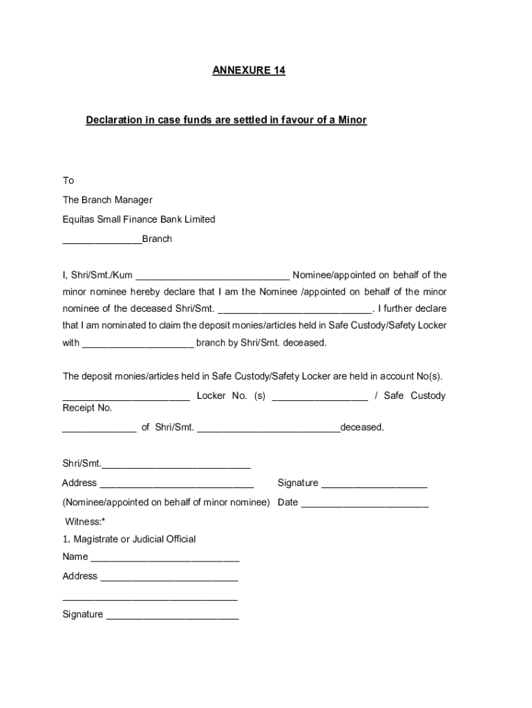 To qualify as a nominee for a minor, certain criteria must be satisfied. A minor can only be designated if they meet the legal age requirements set forth in applicable law, and a responsible adult must be appointed to act on their behalf. Witnesses involved in the declaration must be qualified individuals who are of legal age and capable of providing their confirmation. Specific guidelines apply to ensure that the interests of the minor are duly represented, making it essential to use the Equitas Bank nominee form correctly and comprehensively.