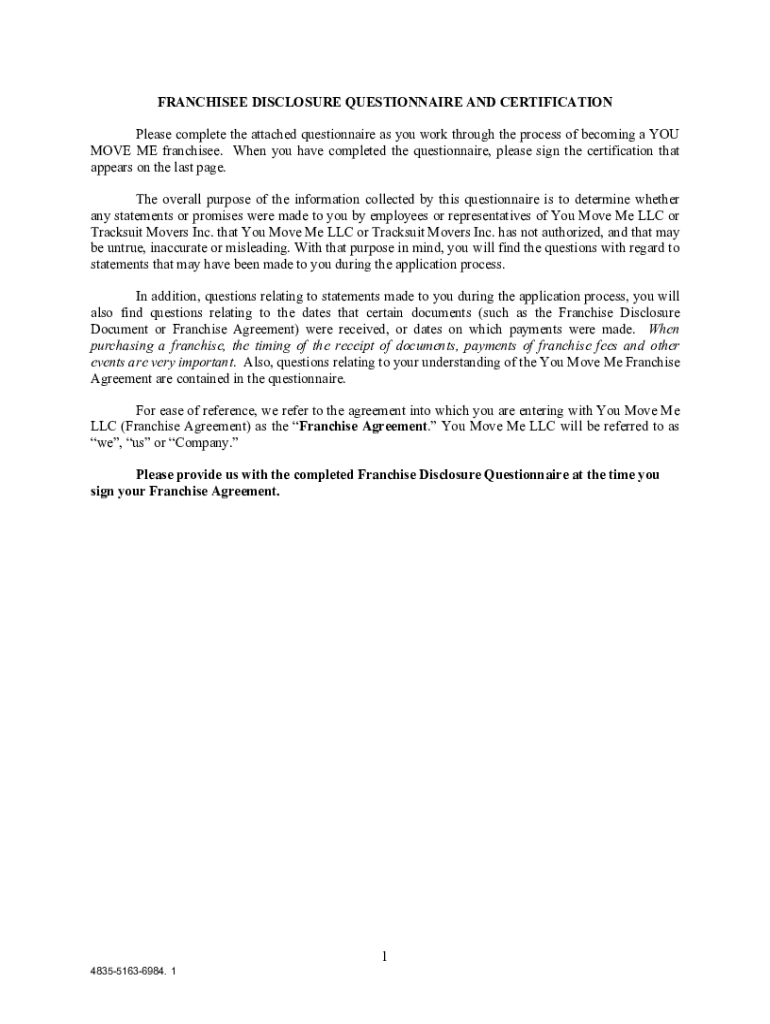 To complete the Franchisee Disclosure Questionnaire and Certification, you should be an individual applying to become a franchisee of You Move Me LLC. Make sure you understand the Franchise Disclosure Document and Franchise Agreement before proceeding.