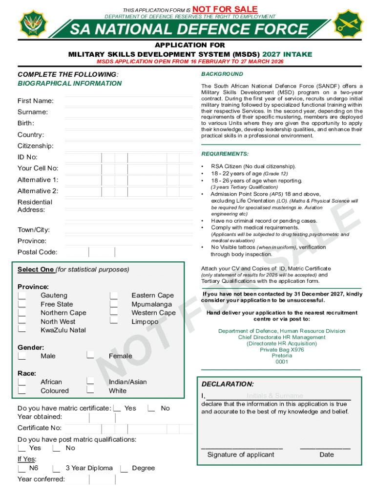 The Military Skills Development System Application Form is a government document used by the South African National Defence Force (SANDF) to recruit candidates for their Military Skills Development (MSD) program.