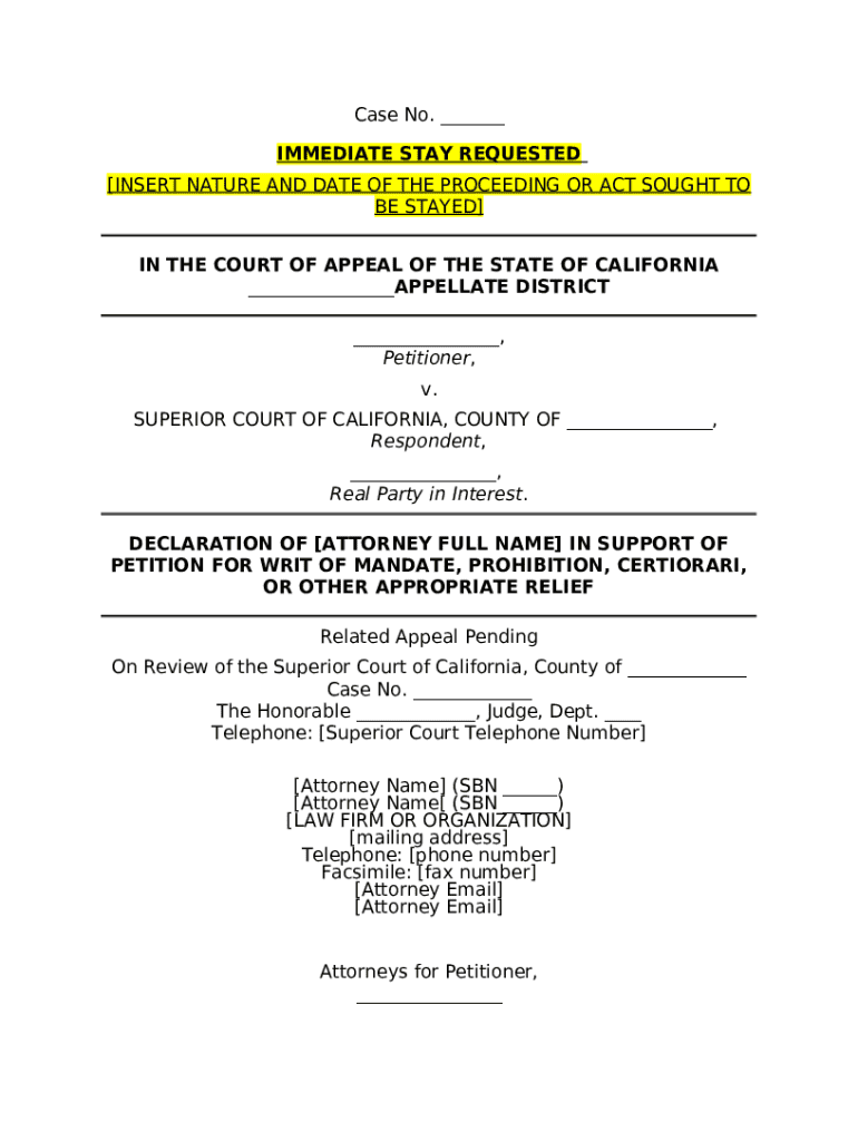 The California Court Appeal Declaration is a legal document used by attorneys to support a petition for a writ of mandate or other appropriate relief during an appeal case.
