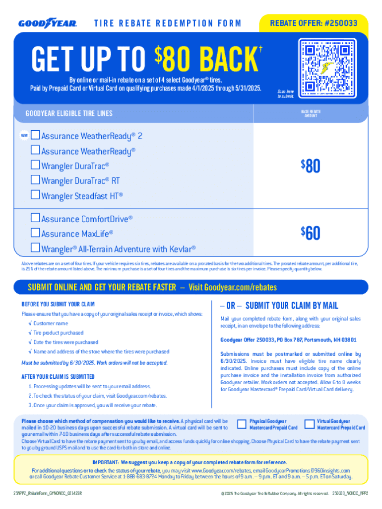 The Goodyear Tire Rebate Form must be submitted by 6/30/2025 to be eligible for the rebate payment.