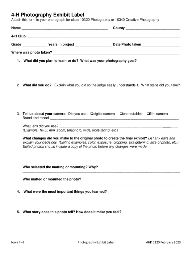 The 4-H Photography Exhibit Label is an education form used by participants in Iowa to document and label their photography projects.