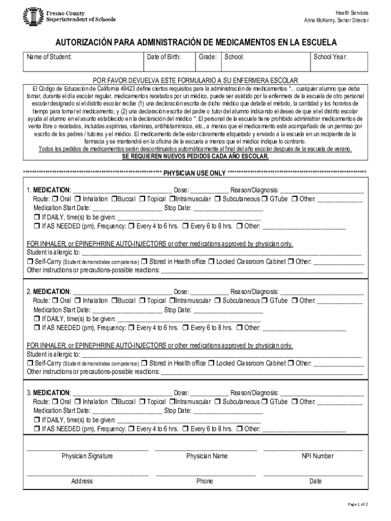 Este formulario debe ser completado por los padres o tutores, así como por un médico que provea la autorización apropiada para la administración de medicamentos.