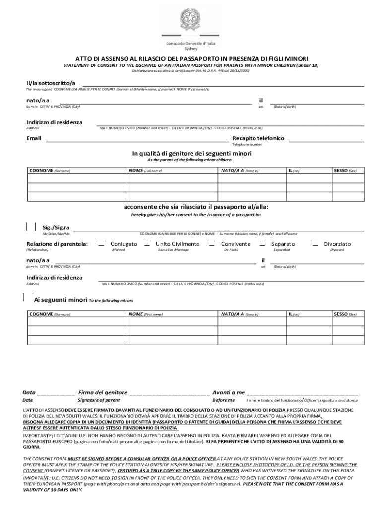 The Italian Passport Consent Form requires signatures from both the parent and a police officer. This must occur in front of a consular or police officer in New South Wales.