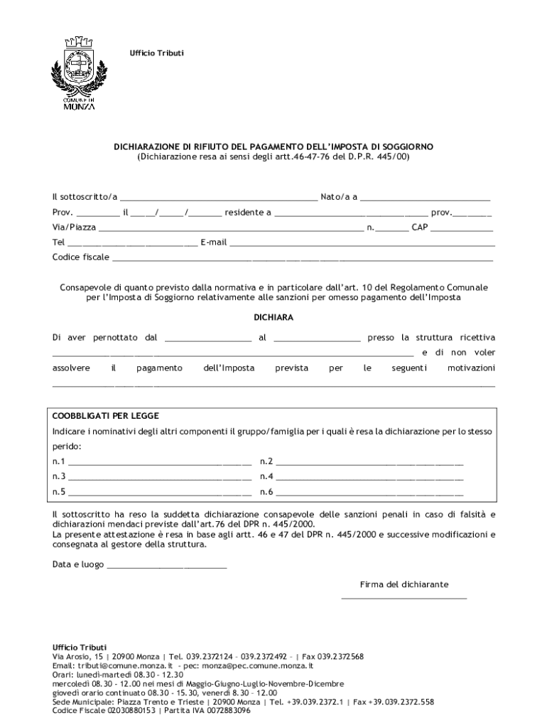Il modulo è destinato a chiunque desideri rifiutare il pagamento della tassa di soggiorno a Monza, spesso turisti o residenti che soddisfano specifiche condizioni di esenzione.