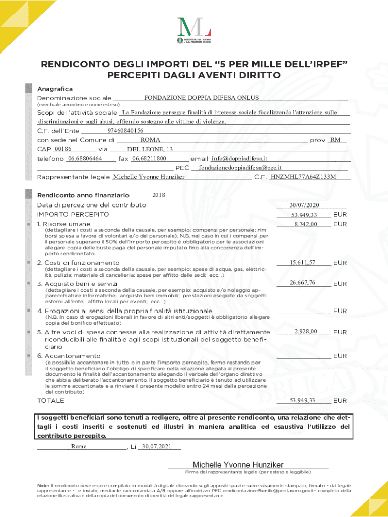 RENDICONTO DEGLI IMPORTI DEL 5 PER MILLE DELLIRPEF PERCEPITI DAGLI AVENTI DIRITTO $QDJUDFD FONDAZIONE DOPPIA DIFESA ONLUS Denominazione sociale ___ (eventuale acronimo e nome esteso)La Fondazione