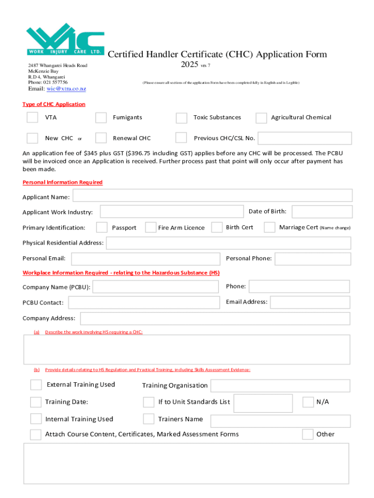 The Certified Handler Certificate (CHC) Application Form is essential for individuals and companies handling hazardous substances in New Zealand. This form serves as the formal request for certification, ensuring compliance with safety regulations. Obtaining a certified handler certificate enhances workplace safety and enables effective management of toxic substances.