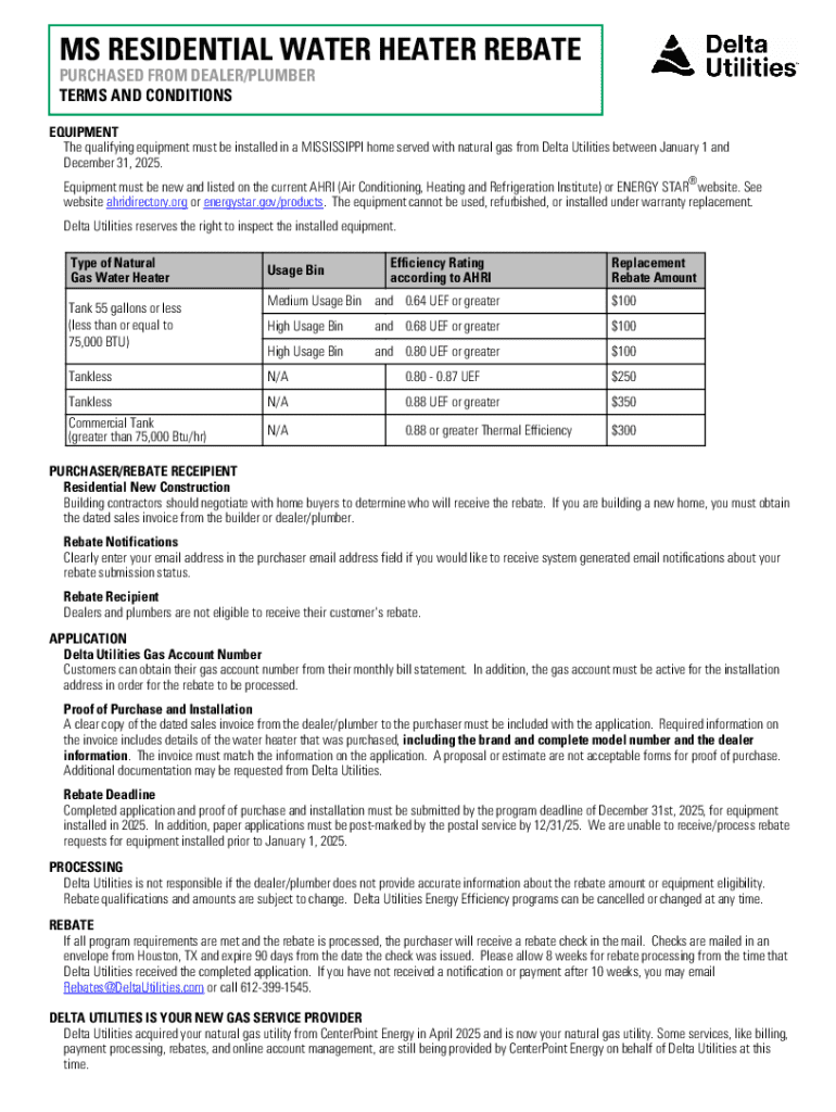 The rebate is available to Mississippi residents purchasing and installing qualifying natural gas water heaters through approved dealers or plumbers.