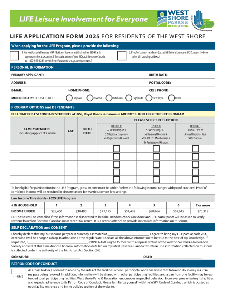 The LIFE Application Form 2025 is a crucial document for residents of British Columbia, specifically aimed at those in the West Shore area who wish to access recreational discounts. This form is utilized by individuals seeking to partake in the LIFE Program, which is designed to provide financial relief through discounted rates on various recreational services based on income eligibility.