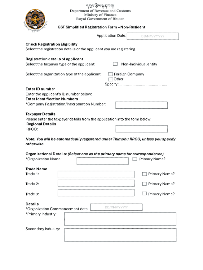 The GST Simplified Registration Form – Non-Resident is a government document used by foreign companies to register for Goods and Services Tax (GST) in Bhutan.