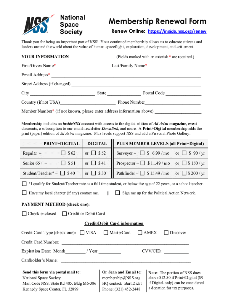 Current members of the National Space Society who are looking to maintain their membership status can use this form for renewal.