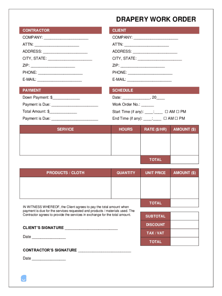 DRAPERY WORK ORDER CONTRACTORCLIENTCOMPANY: ___COMPANY: ___ATTN: ___ATTN: ___ADDRESS: ___ADDRESS: ___CITY, STATE: ___CITY, STATE: ___ZIP: ___ZIP: ___PHONE: ___PHONE: ___EMAIL: ___EMAIL: ___PAYMENTSCHEDULEDown