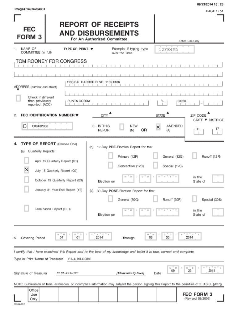 Get the free FEC Form 3 Report of Receipts and Disbursements