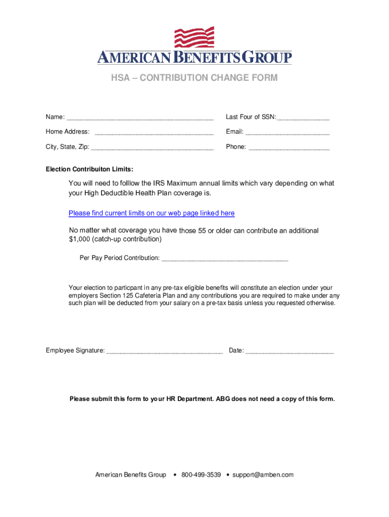 HSACONTRIBUTION CHANGE FORMName: ___Last Four of SSN: ___Home Address: ___Email: ___City, State, Zip: ___Phone: ___Election Contribuiton Limits:You will need to folllow the IRS Maximum annual limits