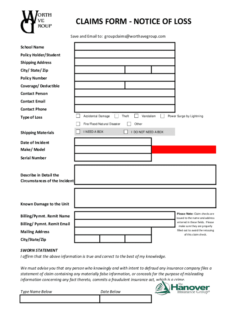 CLAIMS FORMNOTICE OF LOSS Save and Email to: groupclaims@worthavegroup.com School Name Policy Holder/Student Shipping Address City/ State/ Zip Policy Number Coverage/ Deductible Contact Person Contact