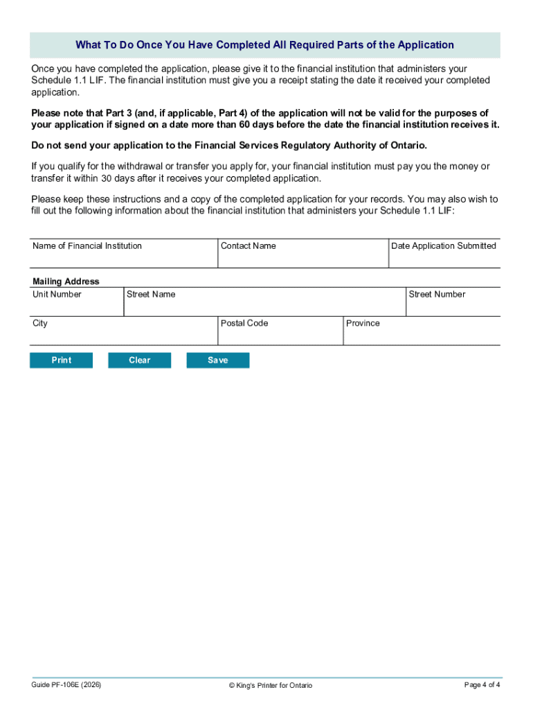 Individuals in Ontario with a Schedule 1.1 LIF who wish to withdraw or transfer up to 50% of their funds can use this application. Both the owner and their spouse must provide necessary verifications.