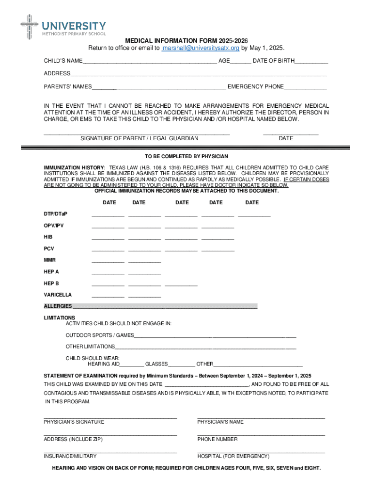 MEDICAL INFORMATION FORM 20252026 Return to office or email to lmarshall@universitysatx.org by May 1, 2025. CHILDS NAME___ AGE___ DATE OF BIRTH___ ADDRESS___ PARENTS NAMES___ EMERGENCY PHONE___IN