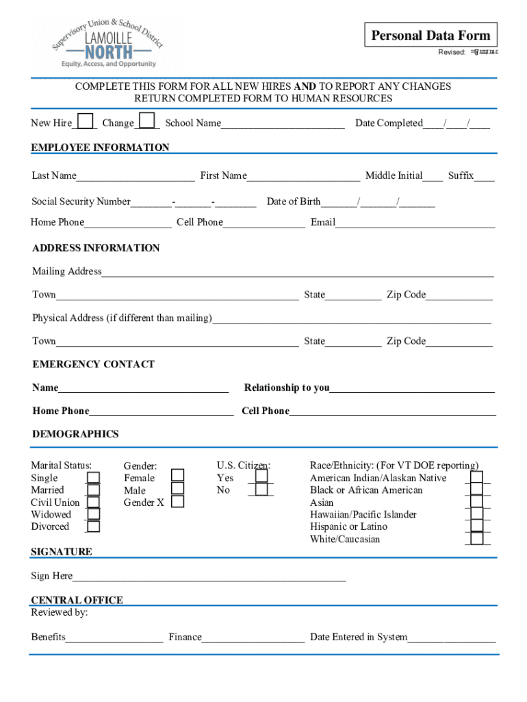 The Employee Personal Data Form is a document used by new hires to provide essential personal information and demographic data to Human Resources in Vermont for reporting purposes.