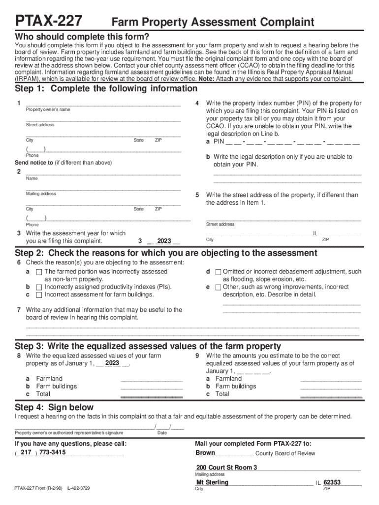 The Illinois Farm Property Assessment Complaint is filed using the PTAX-227 form. This form serves a specific purpose: to allow property owners to formally complain about the assessment of their farm property in Illinois. Key details required on the form include the property owner's name, address, and property index number.