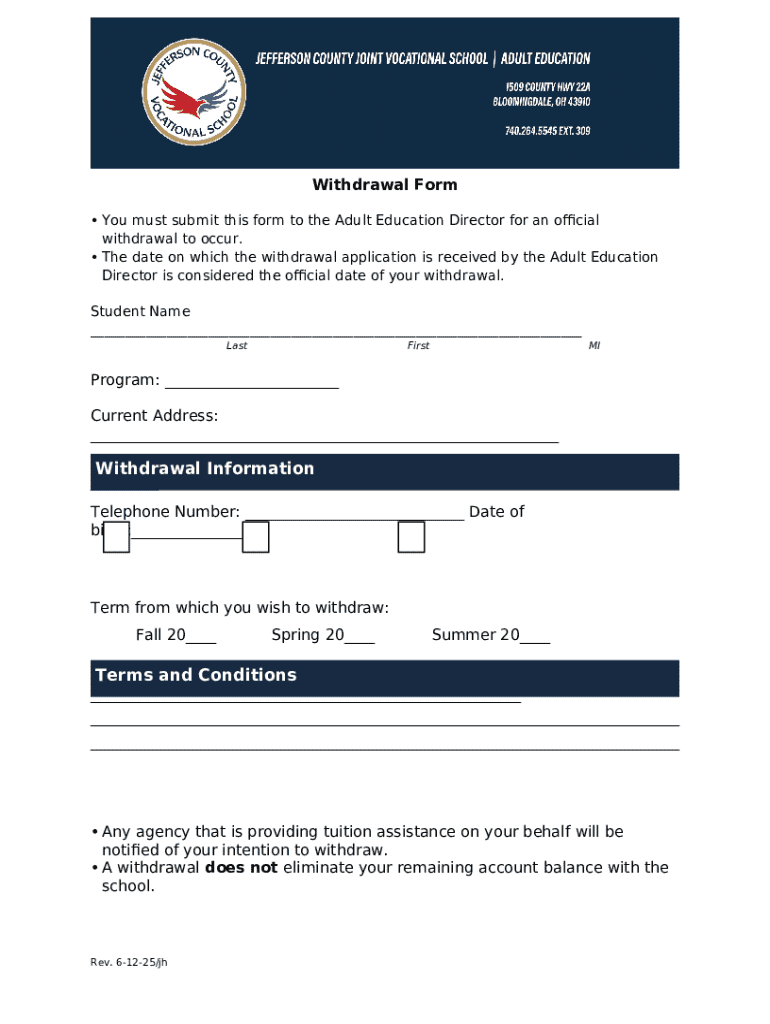 The Student Withdrawal Form is designed for current students enrolled in adult education programs who wish to officially withdraw.