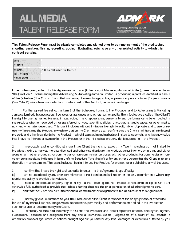 The Talent Release Form is a legal document used by talent and advertising agencies in Jamaica to grant rights for the use of the Talent's name and image in media products.