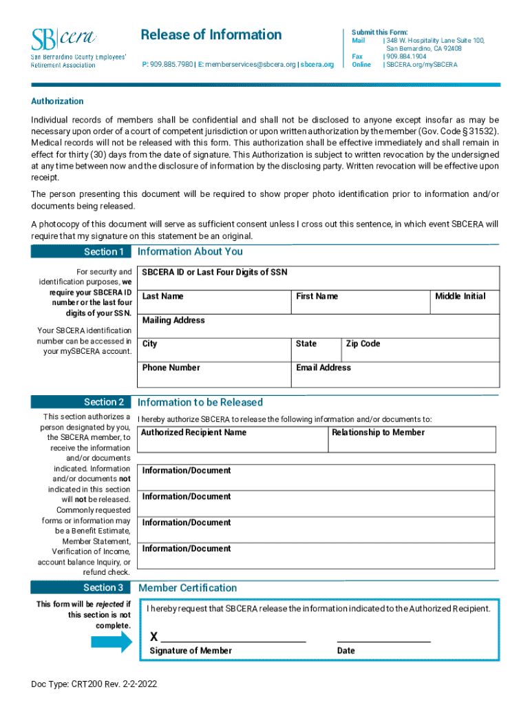 The Release of Information Form is a medical records release document used by members of SBCERA to authorize sharing personal information with designated recipients.
