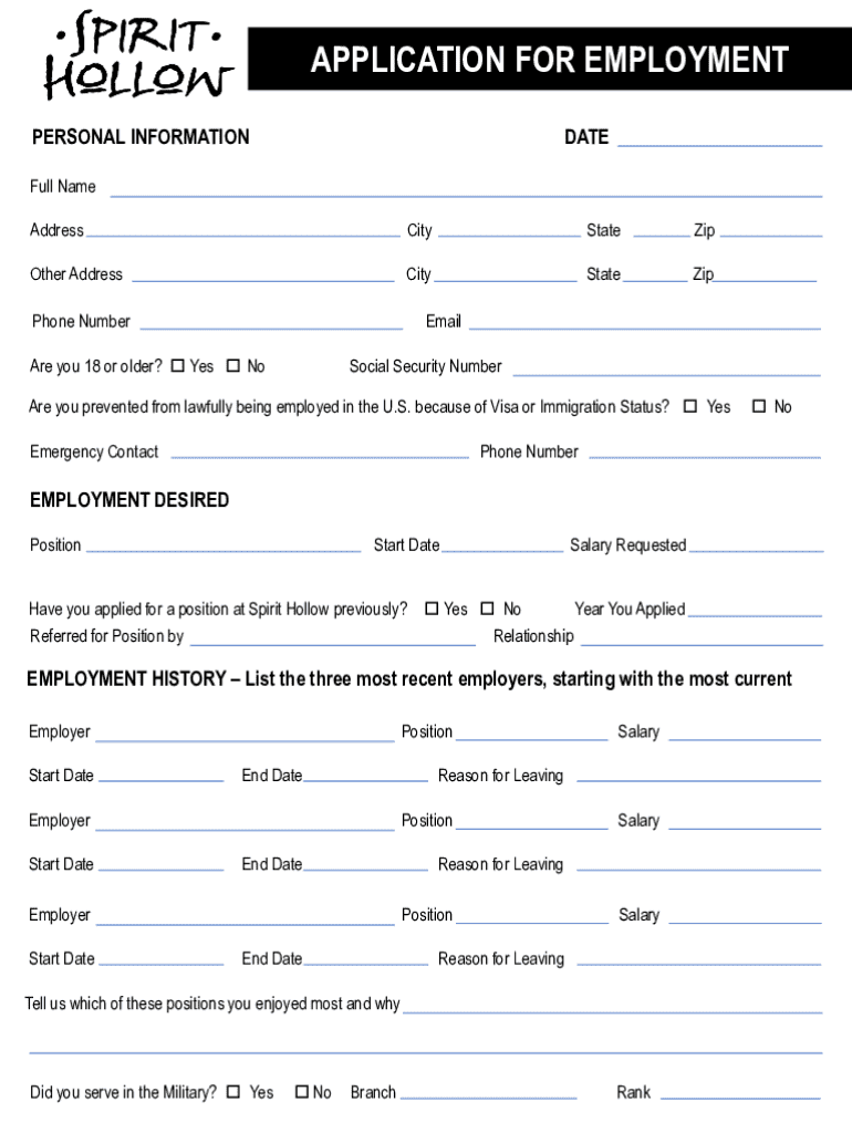 The Application for Employment is a legal document used by Spirit Hollow to gather essential information from job candidates for hiring purposes.