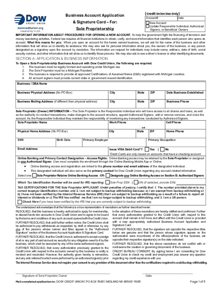 The Business Account Application is a document used by sole proprietors to open a new business account with Dow Credit Union.