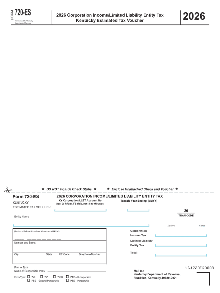 Corporations and limited liability entities conducting business in Kentucky need to submit this voucher to pay estimated income taxes for the taxable year ending in 2026.