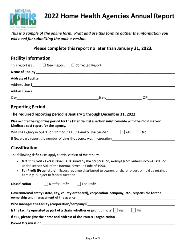 The 2022 Home Health Agencies Annual Report serves as a crucial document for home health agencies operating in Montana. Its primary purpose is to provide a comprehensive overview of agency operations, which includes essential financial and operational data. By capturing this scope of required information, agencies are able to reflect their service levels and financial health transparently, thereby allowing for informed assessments and decisions.