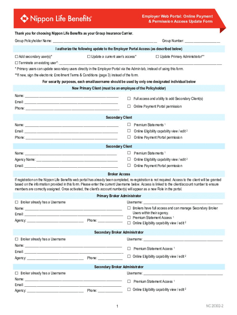 This form is intended for Primary Clients, Secondary Clients, and Policyholders authorized to manage or request updates on access to their group's insurance policyholder portal on Nippon Life Benefits.