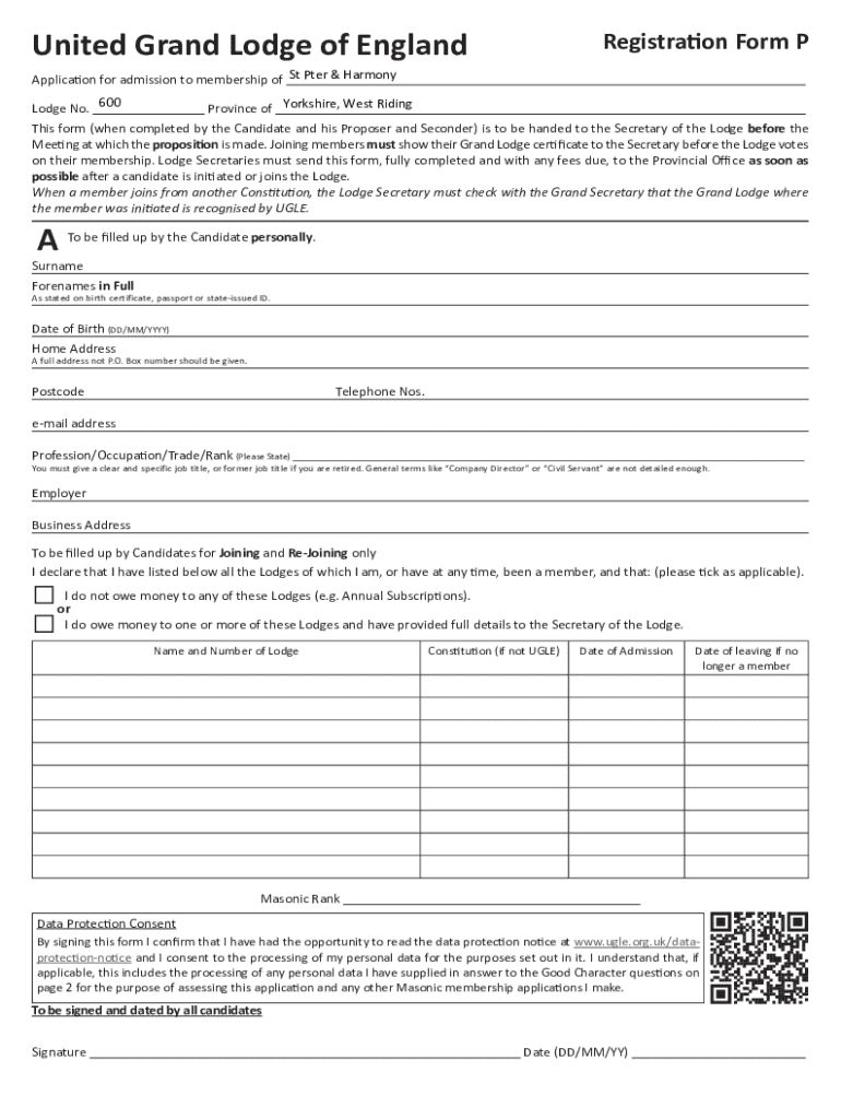 United Grand Lodge of EnglandRegistration Form PApplication for admission to membership of St Pter & HarmonyLodge No. 600 Province of Yorkshire, West Riding This form (when completed by the Candidate