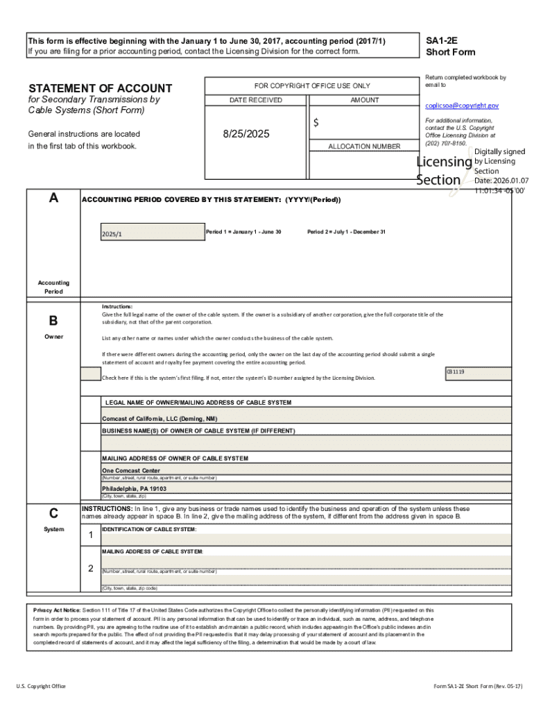 This form requires key details essential for proper filing, including information about the cable systems involved. The applicable accounting period for this form spans from January 1 to June 30, 2025, making timely completion critical for those affected.