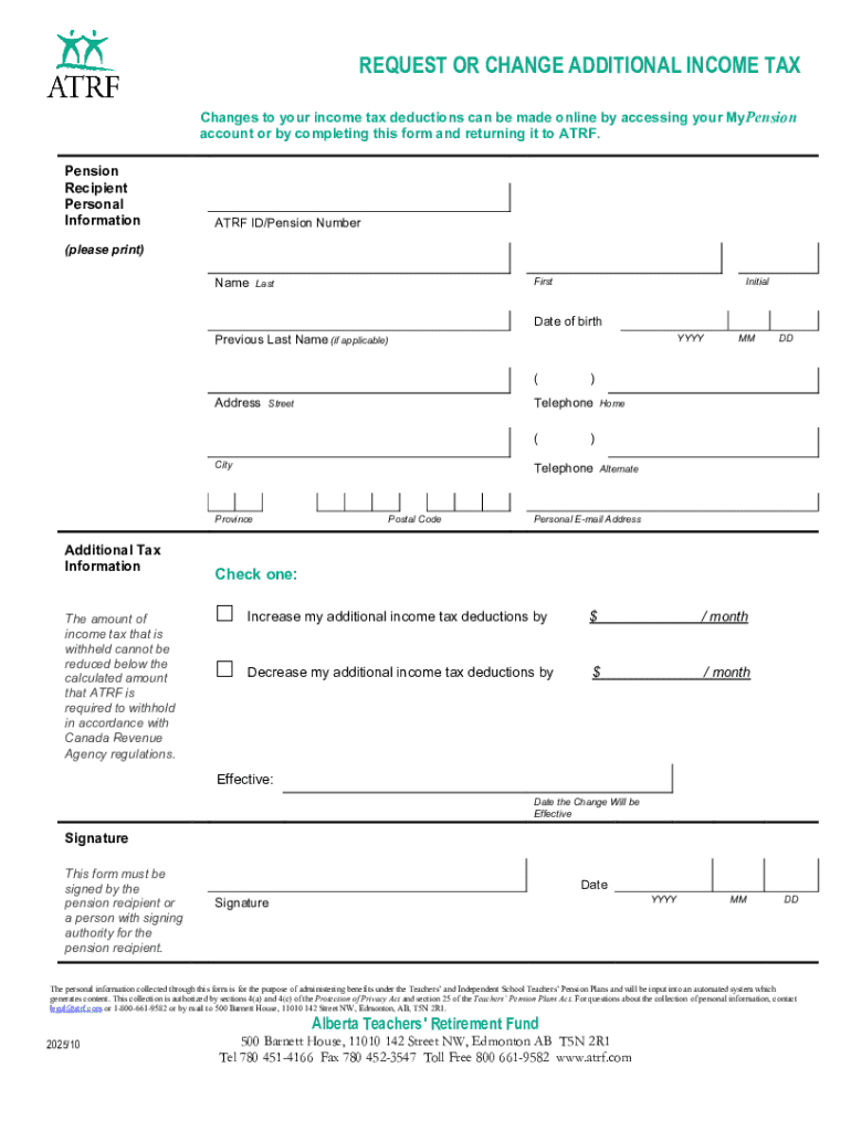 The Alberta Teachers' Request for Additional Income Tax Deductions is a tax form used by pension recipients in Alberta to request adjustments to their additional income tax deductions.