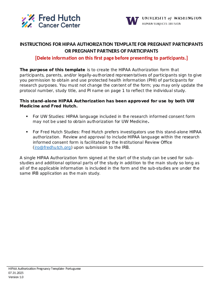 O Formulário de Autorização HIPAA para Participantes Grávidas é um documento essencial que visa obter permissão dos participantes, pais ou representantes legalmente autorizados para usar e divulgar informações de saúde protegidas (PHI) em pesquisas. Este formulário é projetado especificamente para estudos que envolvem participantes grávidas e seus parceiros, e é aprovado para uso pela UW Medicine e Fred Hutch.