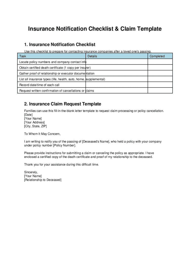Insurance Notification Checklist & Claim Template 1. Insurance Notification Checklist Use this checklist to prepare for contacting insurance companies after a loved one\'s passing. Task Details Completed