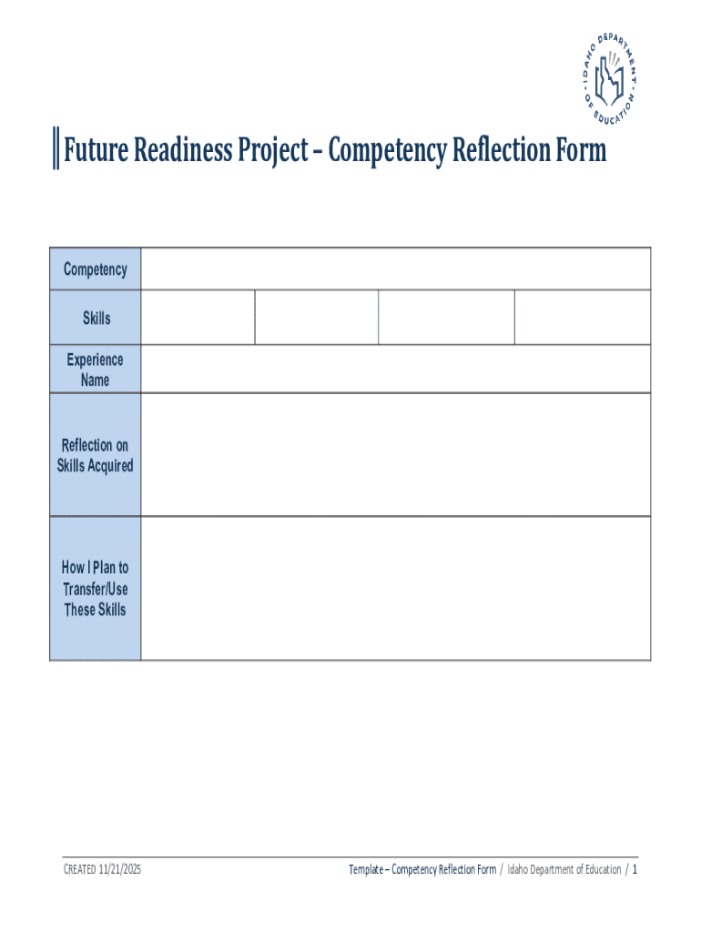 The Competency Reflection Form is designed for students in Idaho, primarily those participating in academic programs that focus on skill development through the Future Readiness Project.