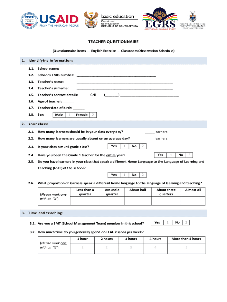 Get the free Teacher Questionnaire