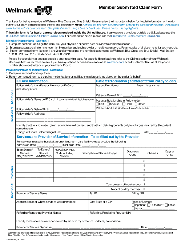 Member Submitted Claim Form Thank you for being a member of Wellmark Blue Cross and Blue Shield. Please review the instructions below for helpful information on how to submit your claim so it processes