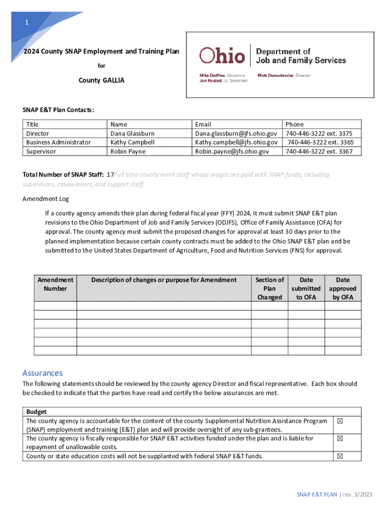 12024 County SNAP Employment and Training Plan forCounty GALLIASNAP E&T Plan Contacts: Title Director Business Administrator SupervisorName Dana Glassburn Kathy Campbell Robin PayneEmail Dana.glassburn@jfs.ohio.gov