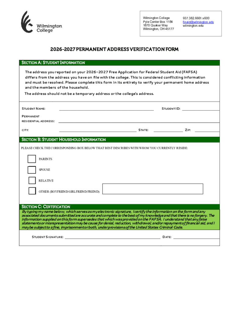 The 2026-2027 Permanent Address Verification Form is a financial aid document used by Wilmington College to resolve conflicting address information between a student's FAFSA and college records.