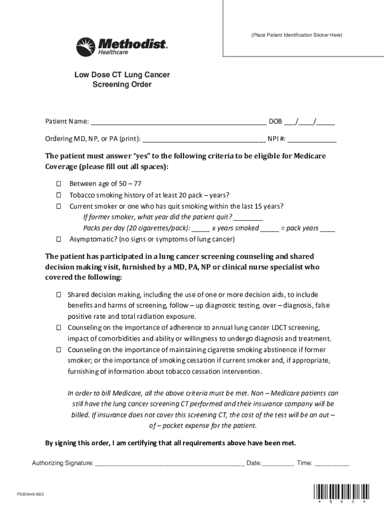 (Place Patient Identification Sticker Here)Low Dose Dose CT Lung Low CTCancer Lung Cancer Screening Screening Order Order Patient Name: ___ DOB ___/___/___ Ordering MD, NP, or PA (print): ___ NPI