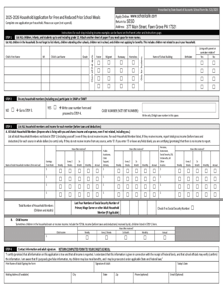 Prescribed by State Board of Accounts School Form No. 521/2025Apply Online: www.schoolcafe.com Return to: SESD Address: 377 Main Street, Fawn Grove PA 1732120252026 Household Applicaon for Free and