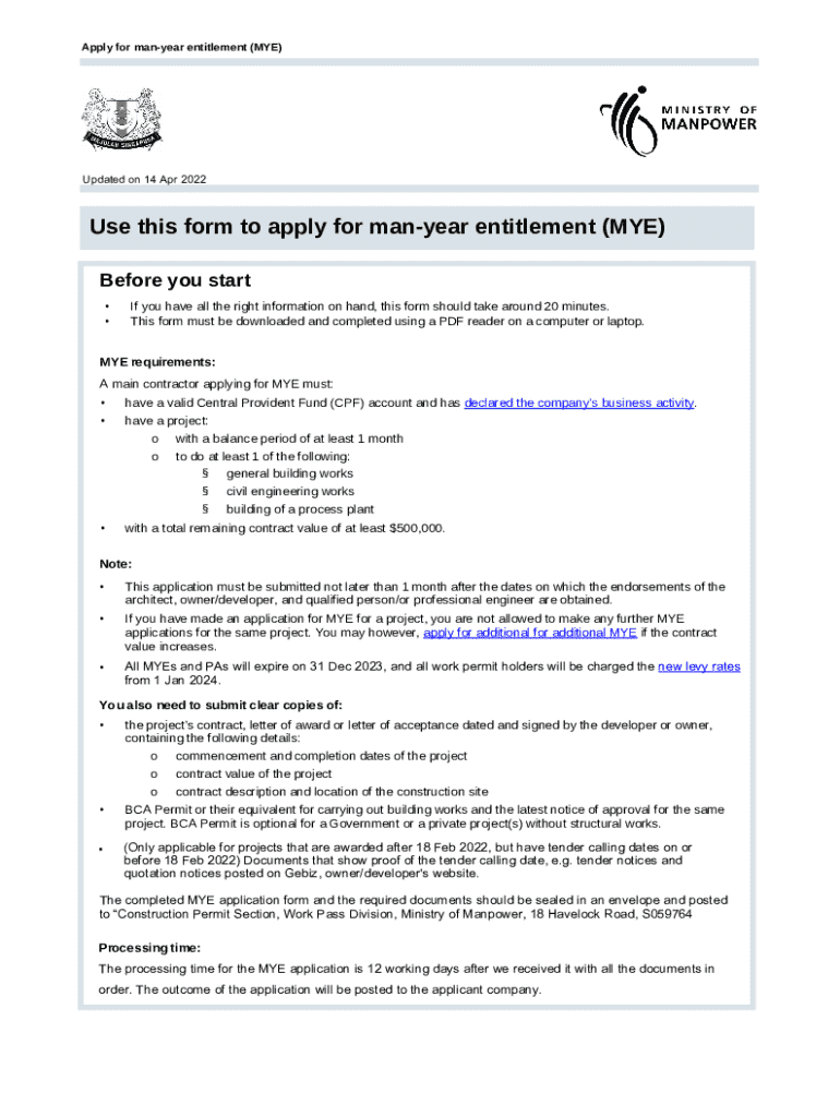 The Man-Year Entitlement Application Form is a permit application used by main contractors in Singapore to apply for MYE for construction projects.